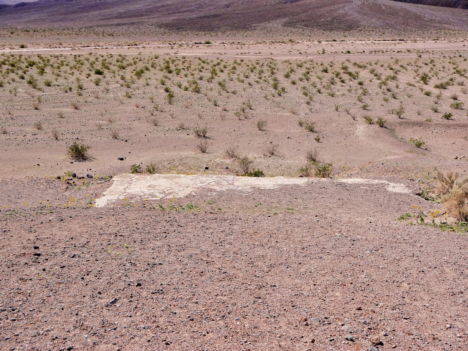 To access the ruins of Ashford Mill, drive 43.6 miles south on Badwater Road from its intersection with California 190 in Furnace Creek. Turn west onto a signed gravel road and drive ¼ mile to the end. The ruins of a 1914 gold processing mill are visible from the parking area or you can walk down to them. The elevation here is approximately 100 feet below sea level. There is no shade other than that created by the office building ruins. Other than a single interpretive sign and the southernmost restroom in Death Valley National Park, a vault toilet, there isn't anything else here other than a few concrete foundations. During our February 2015 visit to the park, we stopped at Ashford Mill because a ranger mentioned there were wildflowers blooming in the area.