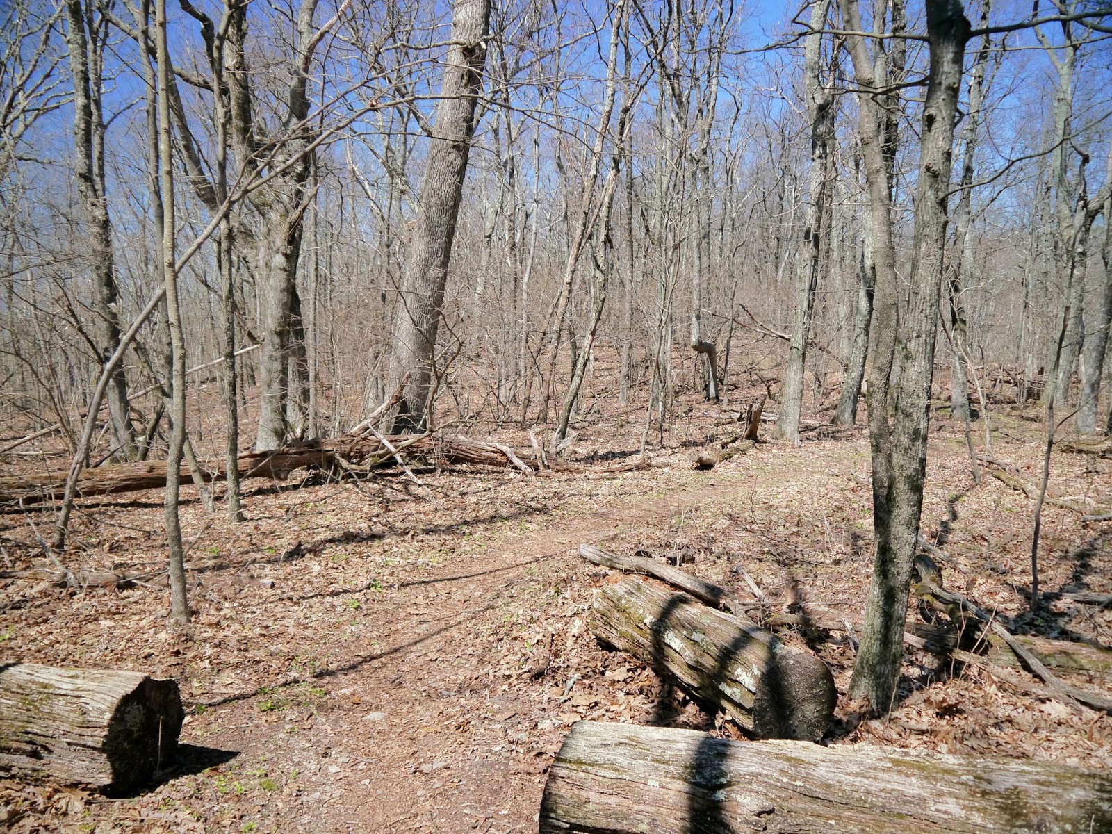 | The trail winds through open forest with lots of leaf litter |